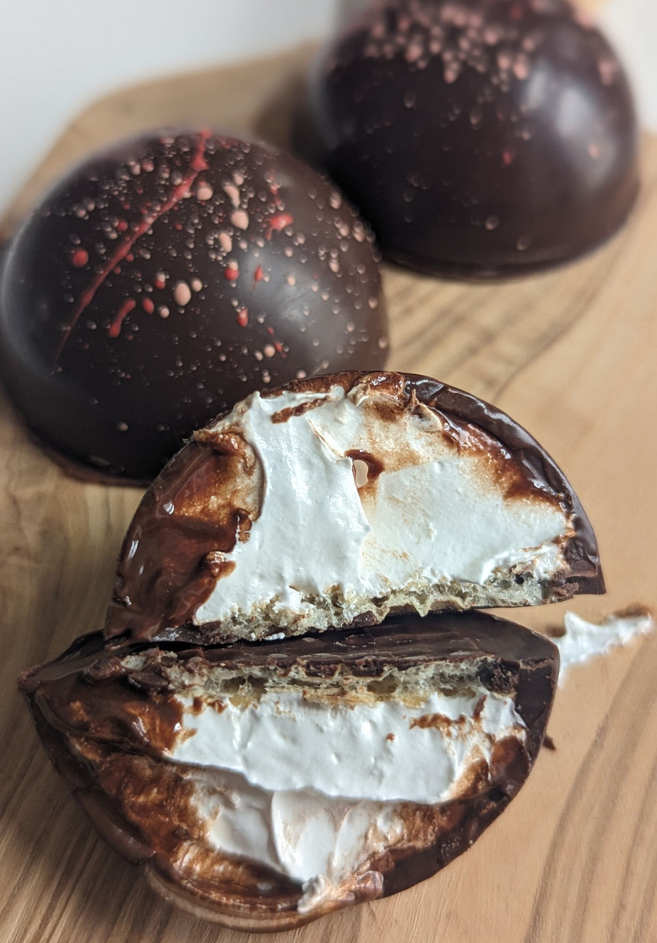 Soft homemade marshmallow over a thin wafer plate, covered with Belgian chocolate.